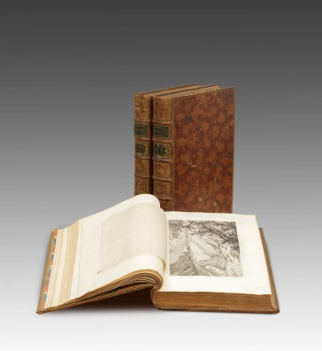 Tableaux topographiques, pittoresques, physiques, historiques, moraux, politiques, littéraires, de la Suisse. (Titel Tafelband:) Tableaux de la Suisse ou voyage pittoresque fait dans les XIII. cantons et états alliés du corps helvétique. 2 Bände + Tafelband. Paris, Clousier, 1780–1786. Folio (50 × 34,5 cm). (3) Bl., LXXXIV (recte LXXIV) S., (1) Bl., 368 S., LXVI S., (3) Bl. (corrections u. additions); (3) Bl., 578 S.; 7 S., 8 S., S. 3–7, (1) Bl. Mit gestochenem Titelblatt mit Vignette, gestochenem Frontispiz, 1 gestochenem Panorama, 1 gefaltetem Umrisskupfer, 377 Abbildungen auf 237 Kupfertafeln (davon 212 Ansichten, 1 Schlachtkupfer mit Legende, 1 Wappen- und Grabkupfer, 4 Tafeln mit Münzen, 3 gefaltete Karten, 1 doppelblattgrosse Karte, 11 Tafeln mit 71 Porträts, 1 gefalteter Plan mit Legende, 1 Tafel mit 2 Abbildungen von Antiquitäten). Marmorierte Lederbände der Zeit mit reicher Rückenvergoldung und handschriftlichem Bibliotheksrückenschild. Cohen/de Ricci 1075. – Lonchamp 3362. – Fürstenberg 46, 101. – Ein bedeutendes enzyklopädisches Werk über die Schweiz und eine prachtvolle Monografie, die durch ihre reiche Bebilderung mit Ansichten und Karten vor allem die landschaftliche Schönheit der Schweiz hervorhebt – mit ihren Schlössern, Seen, Brücken, Tälern, Wasserfällen, Berggipfeln und Gletschern. Die Kupferstiche von Née, Masquelier, nach Vorlagen von Pérignon, Le Barbier. – Kleine Gebrauchsspuren, an den Rändern leicht wasserrandig, insgesamt in gutem Zustand.