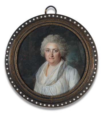 Rundes Miniatur Portrait einer Frau in weissem Seidenkleid