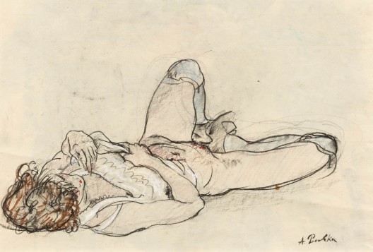 Liegender weiblicher Akt mit hochgeschobenem Hemd
