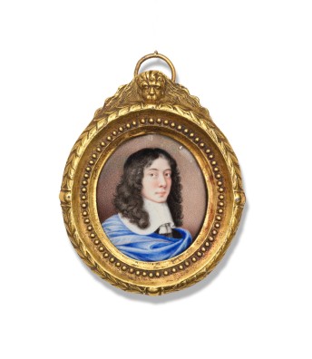 Ovales Miniatur Portrait eines Mannes mit blauem Umhang und weissem Kragen