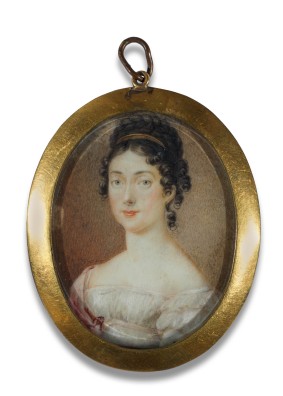Ovales Miniatur Portrait einer jungen Frau in weissem Kleid mit rotem Schal, um 1815