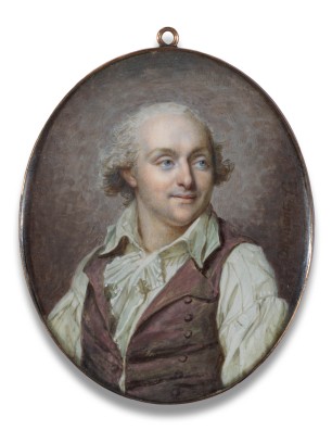 Ovales Miniatur Portrait eines Mannes in auberginefarbener Weste, um 1785/90