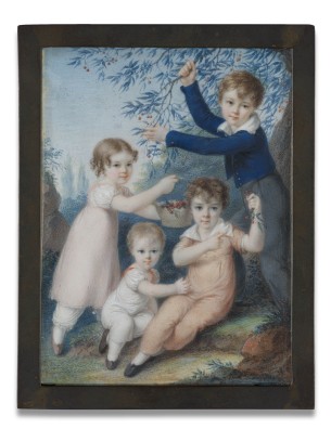 Rechteckiges Miniatur Portrait von vier Kindern beim Kirschenpflücken, 1813